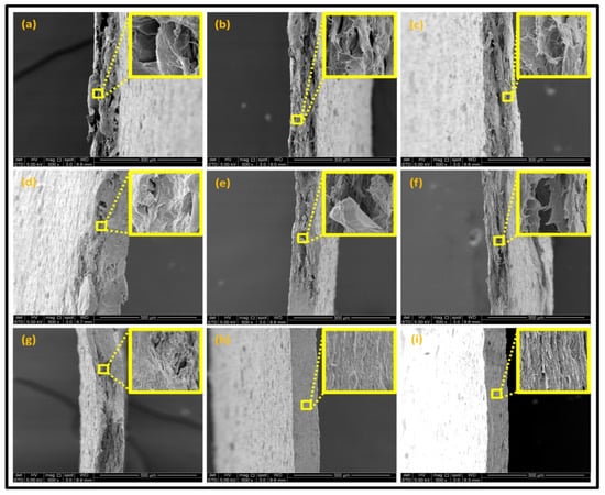 Fracture morphology of (a) control film, macroalgae-based biopolymer film with incorporation of unpurified LNPs of (b) 1%; (c) 3%; (d) 5%; and (e) 7%, and with addition of purified LNPs of (f) 1%; (g) 3%; (h) 5%; and (i) 7%.