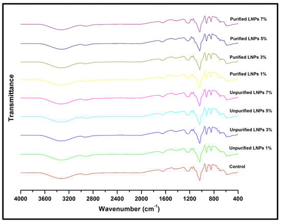 Figure 8 presents the infrared spectra of the raw macroalgae, macroalgae/glycerol (control), and LNPs/macroalgae composite films.