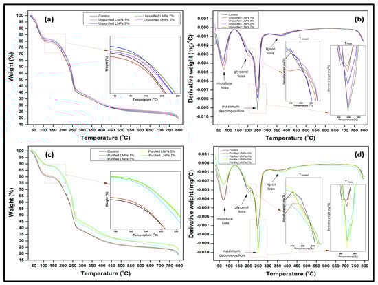 Thermogravimetric analysis of unpurified LNPs based films (a) TGA and (b) DTG, and purified LNPs based films (c) TGA and (d) DTG as a function of temperature for the LNPs/macroalgae biopolymer films.