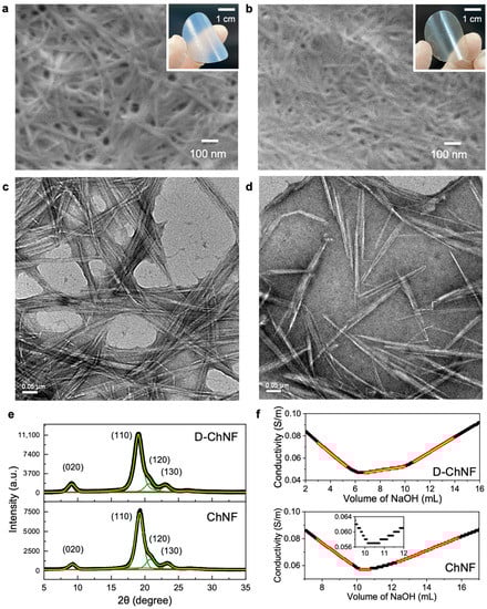 Characterization of D-ChNF and ChNF. FESEM images of (a) ChNF and (b) D-ChNF. The inserts show the appearance of the films. TEM images of (c) ChNF and (d) D-ChNF. (e) Typical X-ray diffraction profiles of D-ChNF and ChNF. The profiles were deconvoluted into the green and red peaks originating from crystalline and amorphous diffraction, respectively, and fitted by the cumulative fit (yellow profile). (f) Conductometric titration plots of D-ChNF and ChNF. The red plots were fitted with the yellow lines, and consumption of 0.05 M NaOH solution was calculated from the two intersections of the three fitted lines. The inset for ChNF shows the magnified plot at around the plateau region.