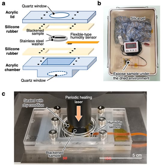 To measure the thermal diffusivity under dry conditions, we used a custom-made sealing chamber that fits the TA33 stage to keep the sample under dry conditions. The samples were fixed in the acrylic sealing chamber shown in Figure 2a and conditioned in a tightbox containing an excess amount of dried silica gel for more than 1 day with the lid open (Figure 2b). The relative humidity in the tightbox was kept below 10%. After sufficient conditioning time, the lid of the sealing chamber was quickly closed, and the thermal diffusivity was measured while maintaining the inside of the chamber under dry conditions (Figure 2c).