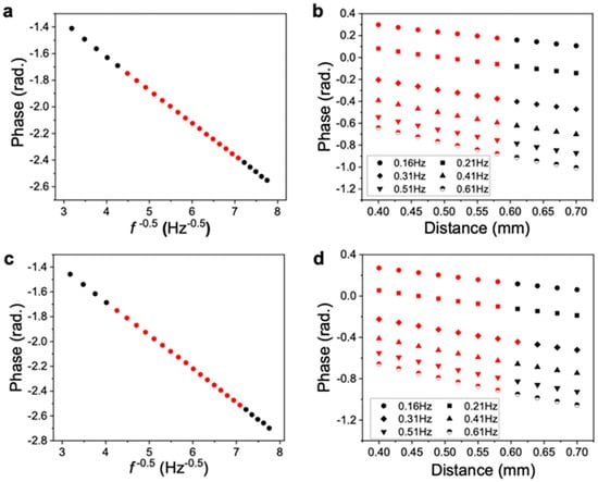 The measured thermal diffusivity results are shown in Figure 4. In the measurement of the thermal diffusivity in the through-plane direction, the frequency of the periodic heating laser was varied at the same point of heating, and the thermal diffusivity was calculated from the rate of change of the phase measured on the sample backside (slope of the plot). For the in-plane direction, in addition to the heating frequency, the phase detection point on the sample backside needed to be changed, and the diffusivity was calculated from the rate of change of the phase with respect to the distance from the heating point [,].