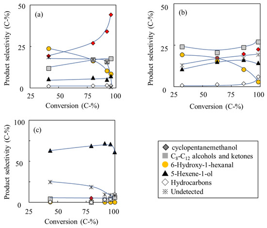 As portrayed in Figure 3a for Ca-HAP(1.72) catalyst, the main product was cyclopentanemethanol. It increased concomitantly with increasing of conversion up to 96%. The C8-C12 oxygenated compound selectivity also increased. In contrast, the selectivities of 6-hydroxy-1-hexanal and the undetected compounds decreased concomitantly with increase of the conversion. The selectivities of 5-hexen-1-ol and hydrocarbons, respectively, recorded as 6% and 1%, were almost constant. As portrayed in Figure 3b for Ca-HAP(1.62) catalyst, the selectivities of the C8-C12 oxygenated compounds, cyclopentanemethanol, and hydrocarbons increased concomitantly with increase of the 1,6-hexanediol conversion. In contrast, the selectivities of 6-hydroxy-1-hexanal and 5-hexene-1-ol decreased concomitantly with increasing conversion. Figure 3c shows that the product selectivities of Ca-HAP(1.54) catalyst were less dependent on the conversion than Ca-HAP(1.72) and Ca-HAP(1.62) catalysts. The main product over Ca-HAP(1.54) catalyst was 5-hexene-1-ol. The 5-hexene-1-ol selectivity decreased concomitantly with increase at conversion of more than 90%. Instead, the hydrocarbon selectivity increased.