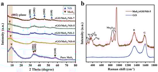 (a) XRD patterns of MoS2/rGO/NiS-X (X = 0, 3, 5, 7) nanocomposite and pure MoS2 (b) Raman spectrum of MoS2/rGO/NiS-5 nanocomposite and GO.