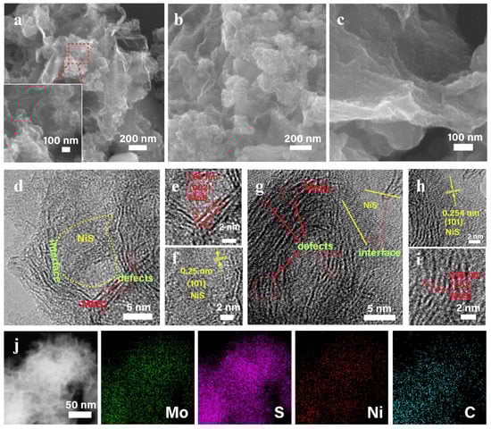 (a–c) SEM images of MoS2/rGO/NiS-5 nanocomposite. (d–i) HRTEM images of MoS2/rGO/NiS-5 nanocomposite. (j) HAADF-STEM and corresponding element mapping images in MoS2/rGO/NiS-5 nanocomposite.