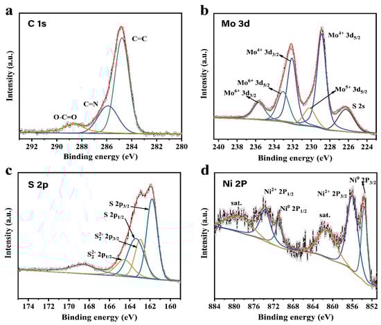 XPS spectra of (a) C 1s, (b) Mo 3d, (c) S 2p, and (d) Ni 2p in MoS2/rGO/NiS-5 nanocomposite.