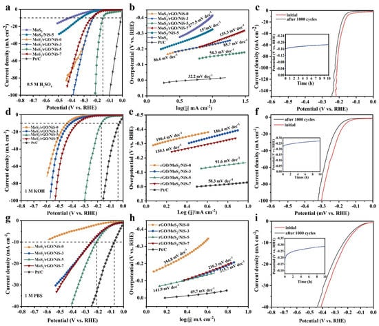 HER catalytic activities of the as-prepared samples. (a,d,g) Polarization curves in 0.5 M H2SO4, 1.0 M KOH and 1.0 M PBS, respectively. (b,e,h) Tafel plots under 0.5 M H2SO4, 1.0 M KOH and 1.0 M PBS, respectively. (c,f,i) The polarization curves of MoS2/rGO/NiS-5 before and after 1000 cycles of voltammetry in 0.5 M H2SO4, 1.0 M KOH and 1.0 M PBS were compared, respectively. Their insets were chronopotentiometric curves under 0.5 M H2SO4, 1.0 M KOH and 1.0 M PBS, respectively.