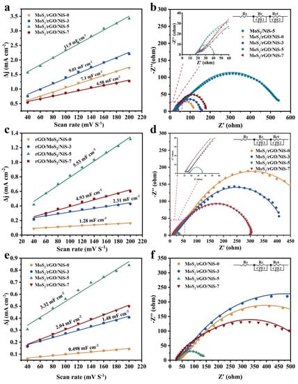 The electrochemical double-layer capacitance (Cdl) of as-synthesized catalysts was measured to evaluate the electrochemical active surface areas (ECSA). Cyclic voltammograms (CVs) with various scan rates from 40–200 mV s−1 (Figures S5–S7) were recorded to calculate Cdl. The capacitance current (Δj = ja − jc) and the scanning rates are fitted into a straight line, and the slope of the line is twice the value of Cdl. The slope of MoS2/rGO/NiS-X (X = 0, 3, 5, 7) are 7.1, 9.01, 11.9 and 4.58 mF cm−2 in 0.5 M H2SO4, respectively (Figure 6a). Notably, MoS2/rGO/NiS-5 with the highest Cdl (5.95 mF cm−2) has the largest ECSA compared to other samples, which further demonstrates its excellent HER performance in acidic medium. The MoS2/rGO/NiS-5 (Cdl = 2.76 mF cm−2) exhibits better HER performance than MoS2/rGO/NiS-7 (Cdl = 2.46 mF cm−2) despite that they have similar ECSA in the alkaline medium (Figure 6c), indicating that the catalytic activity is determined by the coordination of hydrogen adsorption and the active sites of water adsorption/dissociation [46]. Similarly, MoS2/rGO/NiS-5 still has the largest Cdl value (1.66 mF cm−2) in neutral media (Figure 6e).