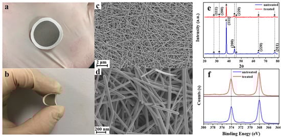 Optical photos of flexible silver nanowire membrane (a,b). (c) Low- and (d) high-magnification SEM images of a silver nanowire membrane. XRD patterns of the silver nanowire membrane before and after cyclic voltammetry (CV) treatment (cycle number: 15; temperature: 20 °C) (e) and the XPS of the silver nanowire membrane before and after CV treatment (cycle number: 15; temperature: 20 °C) (f).