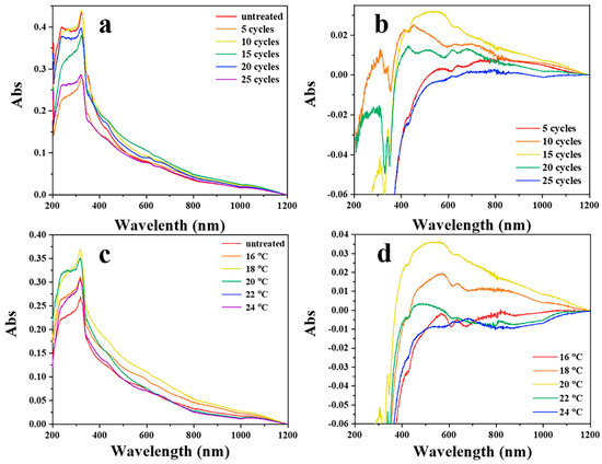 The diffuse reflection spectroscopy of silver nanowires membranes treated with different cycle numbers (a) and at different temperatures (c). Absorption spectrum by subtracting the absorption spectrum of the untreated substrate from that treated with different cycles (5, 10, 15, 20, and 25) by using cyclic voltammetry (b). Absorption spectrum by subtracting the absorption spectrum of the untreated substrate from that treated at different temperatures (16, 18, 20, 24, and 26 °C) by using cyclic voltammetry (d).
