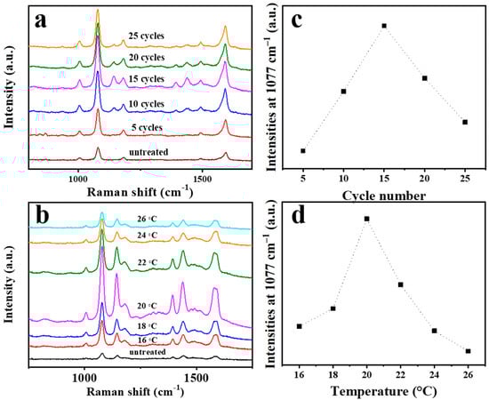 p-Aminothiophenol (PATP) was chosen as the probe molecule to evaluate the SERS activity of the silver nanowire substrates subjected to different scanning cycles (5, 10, 15, 20, and 25 CV cycles) at a scan rate of 0.025 V∙s−1 at 20 °C. As shown in Figure 4a, the SERS signal of PATP increases gradually as the CV scan cycle increases up to the 15th cycle and then decreases. In addition, the temperature of the electrolyte during the CV experiment was also found to affect the SERS performance of the prepared substrate. In order to investigate the relationship between the temperature and Raman activity, substrates treated by CV at different temperatures (16, 18, 20, 22, 24, and 26 °C) were immersed in 10−6 M PATP for 2 h. The SERS spectrum of each substrate is shown in Figure 4b. The SERS performance of the substrate increases at first and then decreases with a further increase in the temperature, with the optimal performance being achieved at the temperature of 20 °C. Therefore, 15 CV cycles at 20 °C were chosen as the optimal conditions for treating the silver nanowire membrane. Figure 4c,d show the SERS intensities at 1077 cm−1 as a function of the cycle number and treatment temperature.