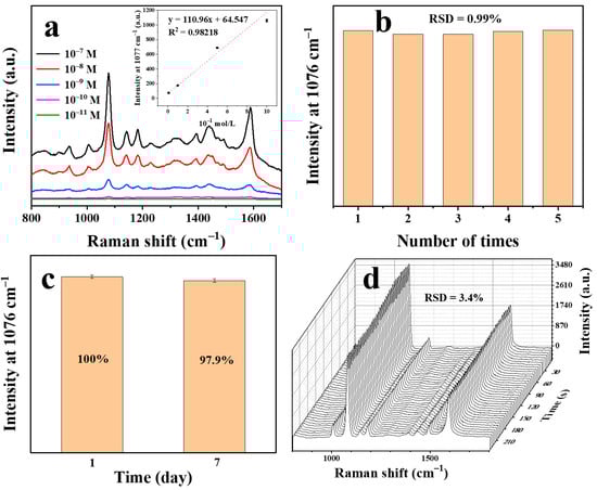 In order to confirm the reproducibility of the SERS sensor, PATP was detected in five replicate samples with a standard sample concentration of 10−6 M. As shown in Figure 5b, the SERS intensity distribution at 1077 cm−1 shows a low relative standard deviation (RSD) of 0.99%, indicating that the SERS intensity change of the proposed SERS sensor is very small. The temporal stability of the SERS substrate was investigated by collecting the spectra of PATP on the SERS substrates exposed to air and under continuous laser irradiation. The SERS intensity stability of the substrate was investigated. The SERS intensities of 10−6 M PATP with fresh substrate and old (exposed to air for 7 days) substrate were recorded (Figure 5c). The substrate exhibited good time stability. Furthermore, as shown in Figure 5d, there is no significant change in the spectra within 240 s. Taking the peak intensity at 1077 cm−1 as the reference, the RSD was calculated to be 3.4%. Thus, the substrates showed high sensitivity and reliable stability, which could facilitate rapid SERS analysis with this substrate.
