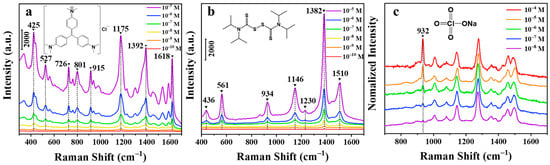 Tetramethylthiuram disulfide (thiram) is a highly efficient and low-toxic pesticide, which is widely used in the prevention and control of crop diseases. However, the excessive residues of thiram in the crops will pose a serious threat to human health, and therefore, the detection of thiram is very important [47]. Figure 6b shows the SERS spectra of thiram in different concentrations on the electrochemically treated silver nanowire film. The illustration is of the molecular structure of thiram. The characteristic peaks of thiram are 439, 563, 928, 1149, 1229, 1392, and 1510 cm−1. Among them, the peak at 563 cm−1 is owing to the stretching vibration of the S-S bond; the peak at 928 cm−1 is attributed to the stretching vibration of CH3N; the peak at 1149 cm−1 arises from the stretching vibration of the C–N bond and CH3 plane; peaks at 1382 and 1510 cm−1 originate from the C–N stretching vibration and CH3 deformation vibration [48]. As is displayed in Figure 6b, the characteristic peak intensity of thiram increases with the increasing of its concentration. In addition, the linear equation was displayed in Figure S9b within the range of 10−10–10−8 M, and the LOD of the thiram concentration was calculated to be 5.4 × 10−11 M.