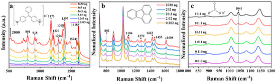 Malachite green, both a dye and a fungicide, is a synthetic poisonous triphenylmethane chemical substance that is widely used in the textile and aquaculture industry. Since triphenylmethane substances have significant carcinogenic effects, they can enter the human body through bioaccumulation [51]. Malachite green is prone to being adsorbed on substrate material, the trace amount of malachite green was swabbed for SERS detection. Figure 7a is the SERS spectra of malachite green. The conventional Raman spectrum of malachite green is shown in Figure S11a for comparison. The inset shows the molecular structure of malachite green. The Raman characteristic peaks of malachite green are 801, 918, 1173, 1220, 1296, 1368, 1397, 1594, and 1618 cm−1 [52]. As is illustrated in Figure 7a, the characteristic peak intensity and the content of malachite green are positively correlated. The linear equation was exhibited in Figure S9d within the dynamic range of 0.0365–3.65 ng. Additionally, the calculated LOD of the malachite green mass was 0.00693 ng.