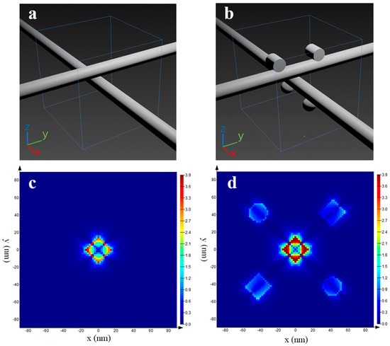 In order to further confirm that the electromagnetic enhancement effect of the CV-treated silver nanowire membrane is stronger than that of the untreated, theoretical simulation was carried under these two situations. In essence, the silver nanowire film is a stack of a large number of silver nanowires. After the CV treatment, some silver nanowires on the membrane surface may dissolve and crystallize into silver nanoparticles or silver nanorods on other silver nanowires surfaces. Based on this, the following models was established, which are shown in Figure 8a,b. Figure 8c,d shows the DDA simulations of the electric field on untreated (c) and treated (d) silver nanowire membranes. These simulated images indicate that not only the number of hot spots increases but also the electric field enhancement factor of the hot spots get higher in the CV-treated silver nanowire membrane. Therefore, the enhancement capability of the silver nanowires membrane is greatly improved after CV treatment, which is in agreement with the experimental results.