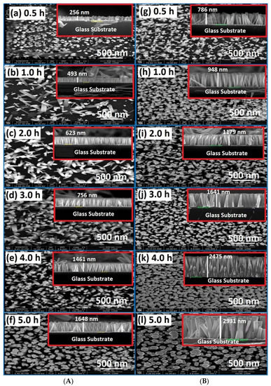 FE-SEM images of ZnO nanorods grownup for different growth periods: (A) no air bubbles and (B) air bubbles. The inset at the top-right corner represents the cross-section of ZnO nanorods for each growth time representing the cross-section of nanorods. ((a,g) for 0.5 h, (b,h) for 1.0 h, (c,i) for 2.0 h, (d,j) for 3.0 h, (e,k) for 4.0 h, (f,l) for 5.0 h growth time respectively).