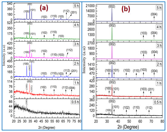 In the case of no air bubbles, the (002) diffraction peak from the XRD pattern is dominant for the different times of 1, 3, 4, and 5 h, as shown in Figure 8a [11], whereas the XRD pattern for 0.5 h revealed a semi-amorphous characteristic, which is in a good agreement with morphology characteristics. Additionally, the ZnO grown for 2 h is described in Figure 8a. The (101) is dominant with a strong diffraction peak, indicating that the ZnO NRs oriented along (101) axis [33]. In the case of no air bubbles, the obtained XRD consequences were in a respectable agreement with the FE-SEM morphology and the preceding works [34,35]. The diffractions peaks from another surface, such as (100), (101), (102), (110), (103), and (112), point to a significant enough number of ZnO NRs to be oriented in these directions [34]. Conversely, when air bubbles were involved in the growth solution, the ZnO NRs’ (002) diffraction peak in all XRD patterns was dominant with growth time from 0.5 to 5 h as displayed in Figure 8b. The narrow, sharp, and strong ZnO (002) peaks in the XRD patterns recognized that the ZnO NRs were synthesized along the c-axis with wurtzite hexagonal structure [36,37]. From all the analysis results of ZnO NRs, it can be observed that the air bubbles and growth times played a vital role in the growth of the ZnO structure.