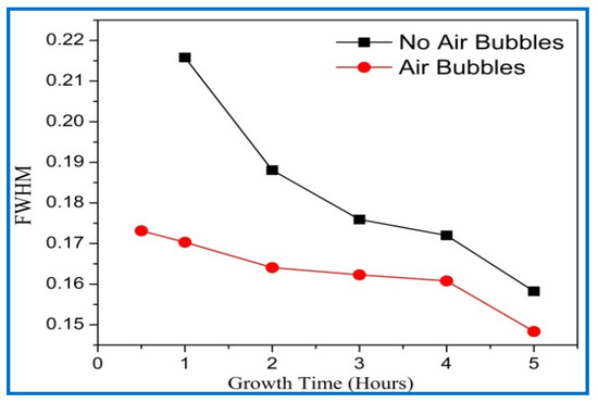 Full width at half maximum (FWHM) of ZnO nanorods of diffraction peak (002) with growth time for both cases: air bubbles not involved and air bubbles involved.
