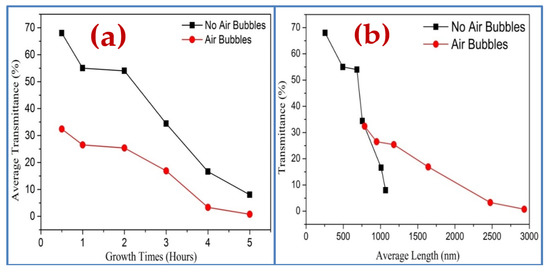 The UV-visible spectrometer is utilized to study the impact of the different growth times on the optical characteristics of ZnO nanorods grown on substrates by both methods. The optical transmittance spectrum from 300 to 800 nm of ZnO nanorods is shown in Figure 14. It can be noticed, from Figure 14a,b, that the spectrums possess high transmittance in the visible region and low transmittance in the UV region for all ZnO samples. In general, the spectrum shows the decrease of transmittance with increasing growth durations. This is possibly related to enhancing the scattering effect in ZnO NRs grown at a longer time in two ways that have thicker ZnO NRs [47,48,49]. Additionally, the transmittance spectrum, in the absence of air bubbles, is almost two times higher than the transmittance spectrum when air bubbles are involved (Figure 15). The reason behind that is, perhaps, related to the thickness, the length of NRs, growth time, and density distribution of ZnO nanorods, as is illustrated in Figure 15a,b. The overall results show the light absorption reducing exponentially with increasing thickness.
