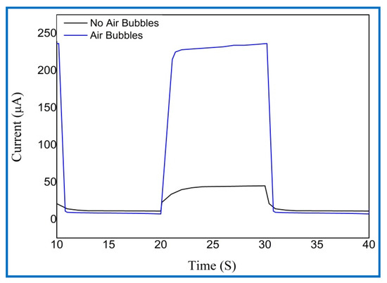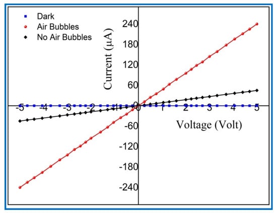 The Al/ZnO UV PDs were fabricated using ZnO NRs based on the optimum growth duration, and, for both methods, during a CBD process at 95 °C and 4 h of growth time. The metal-semiconductor junction shows the Ohmic behavior in the state of the barrier that is resultant in zero connection. Typically, the Ohmic contact relies upon the type of metal used as a contact and the electron affinity of the semiconductor [59]. In this case, the charge carriers needed to be free to move out from the semiconductor and thus across the contact at the lowest resistance [60]. Because the ZnO is an n-type semiconductor, the work function value of the utilized metal contact needed to be reduced or close to the work function of the semiconductor to obtain the Ohmic behavior. The work function value of Al metal contact is 4.08 eV [61], which is smaller than the value of work function of 4.45 eV for ZnO nanowires, which were described by Ju et al. [62]. Figure 17 shows the linear behavior of current-voltage (I-V) characteristics of the fabricated UV PD devices along with the bias voltage of UV device in the range of −5 to 5 V with no air bubbles involved and with air bubbles involved. This linear behavior of (I-V) characteristics with forward and reverse bias voltage indicates the Ohmic contact between the aluminum (Al) electrodes and the ZnO NRs’ networks. Due to the high electrical sensitivity of metallic semiconductors or the resistance of optical detectors under light through to dark conditions, the Ohmic contact possesses negligible junction resistance [63]. Moreover, the Ohmic contact behavior is essential to encourage the photosensing characteristics of UV photodetectors [64].