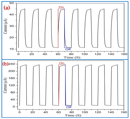 The light responsivities of fabricated UV sensors as a function of wavelength for two methods at a fixed applied bias voltage of 5 V are shown in Figure 18. Additionally, the external quantum efficiency (EQE), which is the number of free carriers generated by one photon, of the devices was calculated from the measured responsivity (R) as EQE = Rhc/eλ and plotted against the wavelength of the incident light (Figure 18). Here, e, h, λ, and c are electron charge, Planck’s constant, wavelength, and speed of light, respectively [67].