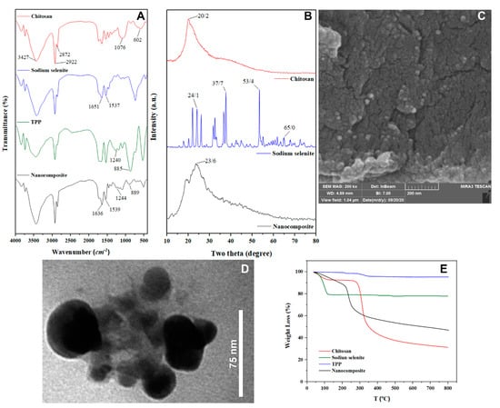 FT-IR (A), XRD (B) SEM (C), TEM (D) and TGA (E) analysis of starting materials and chitosan-selenium nanoparticles (Cs–Se NPs).