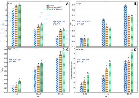 Salinity significantly increased total soluble carbohydrates and free proline by 52.96% and 38.61%, respectively, compared to non-saline controls. However, application of 20 mg L−1 Cs-Se NPs resulted in a larger increase in total soluble carbohydrates by 34.75%, 34.55%, and 28.04% and free proline by 12.30%, 10.08%, and 8.86%, with no salt, 50 and 100 mM NaCl, respectively (Figure 2C,D). Proline is a biocompatible solute that accumulates in plants under stress condition. Szabados and Savoure [69] reported that proline acted as a molecular chaperone to maintain protein integrity. Nawaz et al. [70] showed proline linkage with metal ions useful for defending against damage in stressed plants. One of the key mechanisms for plant tolerance to salinity is accumulation of osmolytes such as free proline and soluble sugars [71]. Ullrich [72] reported that salt stress altered assimilation, accumulation, and metabolism of nitrogen, which plays an essential role in the biosynthesis of proline. In our experiments, salinity caused an accumulation of free proline and total soluble carbohydrates, while application of Cs–Se NPs significantly increased the level of total soluble carbohydrate and proline in bitter melon plants under salt stress. The Se NPs also increased salinity tolerance by stabilizing membranes [73]. Total soluble carbohydrates act as an energy source during salt stress to overcome the perturbation of cellular metabolism and thus maintain growth. Our results are in line with the findings of Zahedi et al. [51] who reported that 10 and 20 mg L−1 Se NP foliar spray significantly increased proline and total soluble carbohydrate on strawberry plants under non-saline and salinity stress condition.