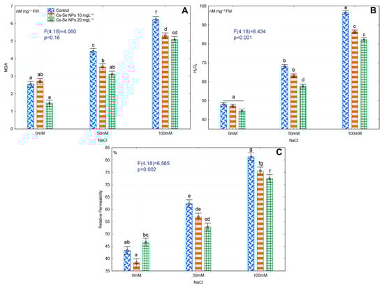 Effect of increasing concentration of Cs–Se NPs on MDA (A), H2O2 (B), and relative permeability (%) (C) of bitter melon (Momordica charantia) leaves under salinity stress. The SDs denoted by lower-case letters in the same treatment indicate significant differences at p < 0.05 by Tukey’s post hoc test.