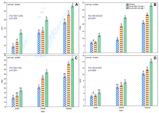 Effect of increasing concentration of Cs–Se NPs on CAT (A), POD (B), APX (C), and SOD (D) enzyme activity in bitter melon (Momordica charantia) leaves under salinity stress. The SDs denoted by lower-case letters in the same treatment indicate significant differences at p < 0.05 by Tukey’s post hoc test.