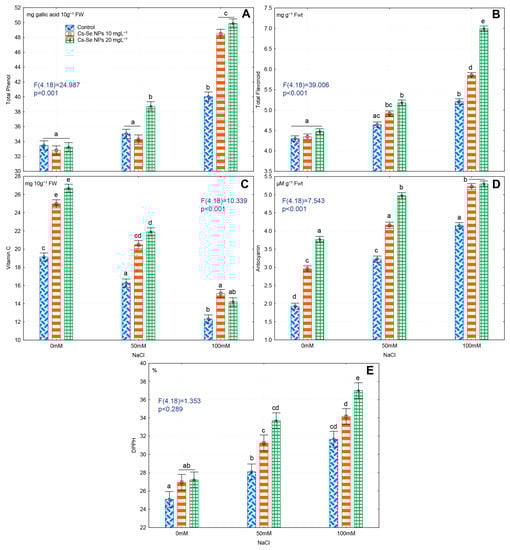 High salinity significantly increased levels of total phenols and flavonoids under salt stress conditions, but foliar application of 20 mg L−1 Cs–Se NPs significantly increased the total phenol and flavonoid content even further. At salinity levels of 50 and 100 mM NaCl, 20 mg L−1 Cs–Se NPs significantly increased phenols by 9.55% and 19.71% and flavonoids by 10.25% and 25.60%, respectively (Figure 5A,B).