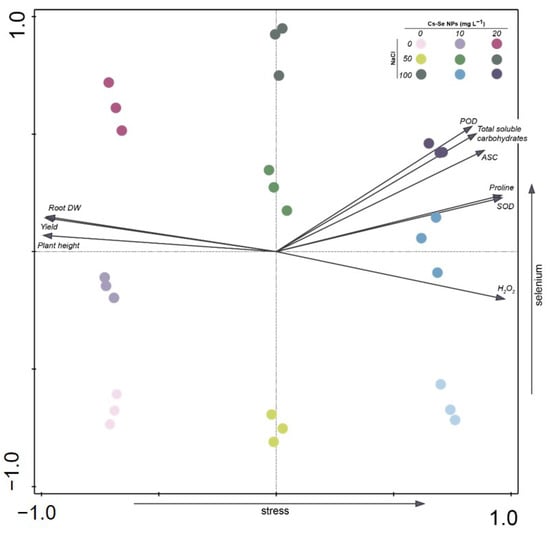 Individual PCA plots were constructed for bitter melon plants subjected to 0, 50, and 100 mM NaCl salt stress and treated with 0, 10, and 20 mg L−1 Cs–Se NPs. The analysis displayed the ten best-fitting variables (plant height, root dry weight, yield, total soluble carbohydrates, proline, hydrogen peroxide (H2O2), peroxidase (POD), superoxide dismutase (SOD), and ascorbate peroxidase (APX). PCA bi-plots of treatment variable associations showed lines originating from the center indicating positive or negative correlations for different variables. Plant height, root dry weight, and yield had negative correlations and total soluble carbohydrates, proline, H2O2, POD, SOD, and APX had positive correlations. When bitter melon plants were grown under salinity stress, plant height, root dry weight and yield decreased and total soluble carbohydrates, proline, H2O2, POD, SOD, and APX increased, while, Cs-Se NPs application increased plant height, root dry weight and yield. Cs-Se NPs application to salt-stressed plants increased total soluble carbohydrates, proline, POD, APX, and SOD more than salinity stress alone. In addition, Cs–Se NPs application under salinity stress conditions decreased H2O2. Cs–Se NPs improved growth parameters, and increased yield by mobilizing osmotic regulators and antioxidant enzymes, and decreasing oxidative stress (Figure 6). Similar to our results, Jiang et al. [48] reported that Se enhanced plant resistance to salinity stress by increasing synthesis of osmotic regulators, promoting antioxidant activity, and decreasing ROS.