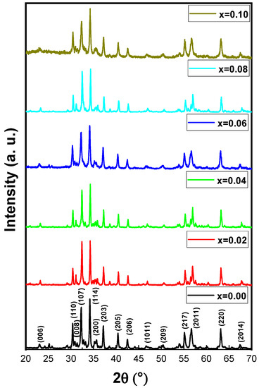 XRD powder patterns of Sr0.5Ba0.5SmxDyxFe8−2xO19 (0 ≤ x ≤ 0.10) MSNPs.