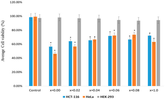 Cell viability by using MTT (3-(4,5-Dimethylthiazol-2-yl)-2,5-diphenyltetrazolium bromide) assay: The MTT assay was done on HCT-116, HeLa and HEK-293 cells which were treated with Sr0.5Ba0.5DyxSmxFe8−2xO19 (0.00 ≤ x ≤ 1.0) MSNPs with dosages ranging from 5.0 µg to 75 µg/mL. The cells were treated for 48 h and processed for MTT assay. In the control group, MSNPs was not added. * p < 0.05.