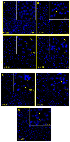 (A–D): Cancer cell death due treatment of nanoparticles, showing the impact of treatment of nanoparticles on HCT-116 cells stained with DAPI post 48 h treatment. (A) is the control cell alongside (B) (x = 0.00), (C) (x = 0.02), (D) (x = 0.04) where a significant number of cancer cells death can be observed due to (50 µg/mL) treatment. Arrows show the cell membrane disruption, nuclear condensation and fragmentation. (E–G): Cancer cell death due treatment of nanoparticles, showing the impact of treatment of nanoparticles on HCT-116 cells stained with DAPI post 48 h treatment. (A) is the control cell alongside (E) (x = 0.06), (F) (x = 0.08), (G) (x = 0.10) where a significant number of cancer cells death can be observed due to (50 µg/mL) treatment. Arrows show the cell membrane disruption, nuclear condensation and fragmentation.