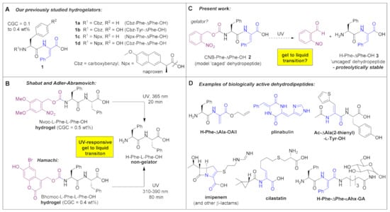 Panel (A): Our previously reported aromatic-capped dehydrodipeptide hydrogelators 1a–d. Panel (B): Previous UV-responsive peptide hydrogel system based on the photo-cleavage of Ar-Phe-Phe-OH to H-Phe-Phe-OH. Panel (C): Our target CNB-capped peptide 2 and how it might act as a photo-responsive hydrogel for the light-triggered release of dehydrodipeptide 3. Panel (D): Structures of known biologically active dehydrodipeptides—the system illustrated in Panel C could potentially be adapted for the release of therapeutic molecules. H-Phe-ΔAla-OAll is a cathepsin B inhibitor, plinabulin is in phase 3 clinical trials for non-small cell lung cancer, Ac-ΔAla(2-thienyl)-Tyr-OH activates macrophages for the selective killing of cancer cells. Imipenem/cilastatin in combination is a wisely used antibiotic. H-Phe-ΔPhe-εAhx-GA is an antimicrobial compound [36,37,38,39,40].