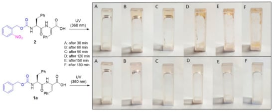 It was envisaged that exposing CNB-Phe-ΔPhe-OH (2) to UV light would generate the more water-soluble dipeptide H-Phe-ΔPhe-OH (3), accompanied by a disruption to the hydrogel fiber network. Therefore, a gel composed of 2 might be expected to undergo a gel-to-sol transition upon exposure to UV light, along with precipitation of the aqueous-insoluble o-nitrosobenzaldehyde by-product. To this end, a hydrogel of 2 was prepared in a UV cuvette in the same way as described in Section 2.2 (0.4 wt.%, 4.0 mg/mL) and left to stabilize overnight. The sample of hydrogel was then irradiated with UV light (360 nm) for 3 h, with an inverted tube test being made every 30 min. We were concerned that repeated inversions might have a destabilizing effect on the gel, and therefore a gel of Cbz-Phe-ΔPhe-OH (1a) (not photo-labile) was used as control, to verify that any gel-to-sol transition could be attributed solely to the removal of the aromatic capping group. After irradiating 2 with UV (360 nm) for 1 h, a slight darkening was observed, and a small amount of water was extruded from the gel (Figure 2, top, B). After 2 h, the onset of gel disintegration was observed (Figure 2, top, D), and after 3 h the gel-to-sol transition was complete (Figure 2, top, F). In contrast, irradiation of 1a for 3 h produced no clear visible change to the gel composition (Figure 2, bottom, A–F).