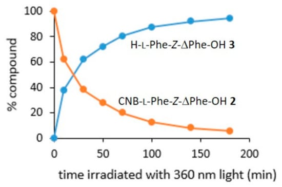 3.5. 1H NMR Study of the Time-Course of CNB-Phe-ΔPhe-OH (2) Conversion to H-Phe-ΔPhe-OH (3) under UV Light (360 nm) Exposure