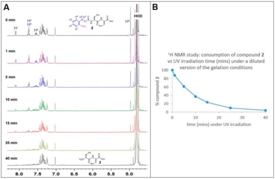 The conversion of CNB-Phe-ΔPhe-OH (2) to H-Phe-ΔPhe-OH (3) upon exposure to UV light (360 nm) was studied by 1H NMR, under a diluted version of the final gel conditions, within an NMR tube. The hydogelation conditions presented in Section 2.3 were modified slightly, in that 2 was dissolved in a mixture of D2O and NaOD (1 M) solution, instead of H2O and NaOH (1 M) solution, to a final concentration of 0.3 wt.%. After the addition of GdL, the solution was immediately transferred from the vial to an NMR tube and the solution was left overnight to allow self-assembly to occur. The 1H NMR spectrum of the resulting sample showed the expected resonances for CNB-Phe-ΔPhe-OH (2) and for GdL.