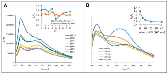 The fluorescence emission spectra of hydrogelator 2 shows a main band with maxima at ~315 nm, and a second fluorescence emission band with maxima at ~370 nm (Figure 6A), which are associated with monomeric and aggregated species, respectively [13,14,15,16]. The aggregate-to-monomer ratio (I2/I1) was plotted against pH (Figure 6A, inset). Hydrogelator 2 follows a trend similar to hydrogelator 1a (and other reported hydrogelators) [12], where an increase of the aggregate-to-monomer emission ratio is observed when pH of the gelator solution is slightly above the pKa of the carboxylic acid (expected pKa ~4), with an optimal pH of pH 5. This fits closely with the hydrogelation results in Section 3.2, where gelation of 2 occurred at pH 5.5. As the pH is further reduced to pH 2, the aggregate-to-monomer ratio decreases. Above pH 5, the aggregate-to-monomer ratio drops for both 2 and 1a, sharply in the case of 2. The level of aggregation recovers somewhat in both cases when pH > 7. The profile for 1a then shows a secondary maximum at pH 8. This, and the overall shallower profile, may explain why 1a forms a hydrogel at pH 7.3 with a heating/cooling cycle, whereas 2 does not.