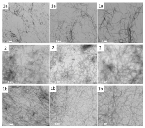 It is evident that this trend is opposite to the one suggested by the gel structures presented in Section 3.8, since more fibers are imaged for gel 2 than for gel 1a. In the Flory theory, the elasticity of the network originates from the change in the conformational entropy of flexible polymer strands resulting from the network deformation. However, such contribution is known to be negligibly small in networks made of rod-like strands where elasticity is mainly due to the deformation of the individual strand and thus essentially depends on the elastic properties of the strand and its rod-like character [52]. Thus, one cannot simply connect the gel elasticity to the mesh size or fiber density imaged in Figure 7. Instead, a lower bending modulus of less rigid-like fibers, a larger number of elastically non effective fibers (and thus a drop in N as such fibers are not network strands) or even non affine network deformation can be invoked, among other factors, to explain the lower modulus G exhibited by gel 2.
