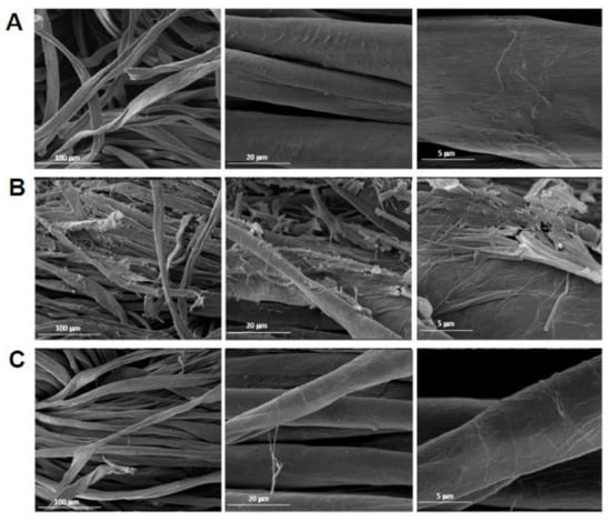 STEM images were recorded using a NanoSEM—FEI Nova 200 (FEI Technologies, Inc., Hillsboro, OR, USA), operating at 15 kV, coupled to an Electron Dispersive Spectroscopic analyzer (EDS) (FEI Technologies, Inc., Hillsboro, OR, USA) and Electron Backscatter Diffraction EDAX—Pegasus X4M analyzer (Pegasus Laboratories, Inc., Pensacola, FL, USA) and detection system (EBSD) at SEMAT (Serviços de Caracterização de Materiais), Guimarães, Portugal. After preparation of the hydrogel, a small portion of each sample was placed onto a TEM 400 mesh copper grid with Formvar/Carbon (ref. S162-4 from Agar Scientific Ltd, Essex, UK), held by tweezers and the excess solution was cleaned. The processing of STEM images was performed using ImageJ software (National Institutes of Health (NIH), Bethesda, MD, USA), which consisted in enhancing local contrast and adjusting brightness followed by manual selection of fibers.