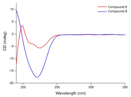 Circular dichroism spectra of compounds 2 and 3 at 0.01 wt.%.