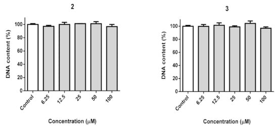 DNA content of HaCaT cells treated with CNB-Phe-ΔPhe-OH (2) and H-Phe-ΔPhe-OH (3) for 24 h, at the concentrations presented.