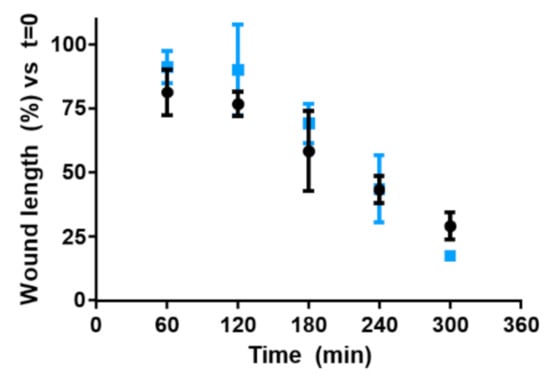 Images were acquired in an inverted Eclipse Ts2R-FL (Nikon Instruments Inc., Melville, NY, USA) equipped with a Retiga R1 camera (QImaging, Surrey, BC, Canada) and an S Plan Fluor ELWD 10× DIC N1 objective (Nikon Instruments Inc., Melville, NY, USA). Images were analyzed with Fiji/ImageJ software version 1.51 (Fiji, Madison, WI, USA) [46]. Brightfield images were acquired, which were then transformed (Fiji’s “find edges” command + green LUT) in order to highlight the edges of the wound. For quantitative parameters, the width of the wound gap was measured using Fiji’s built-in measure function. For each experimental condition, at least 12 data points were recorded.