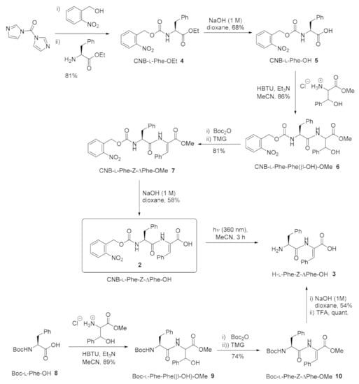 Synthesis of CNB-Phe-ΔPhe-OH (2) and H-Phe-ΔPhe-OH (3). Irradiation with UV light converts (2) to (3). The C=C double bond in dehydroamino acid residues is present as the Z geometric isomer.