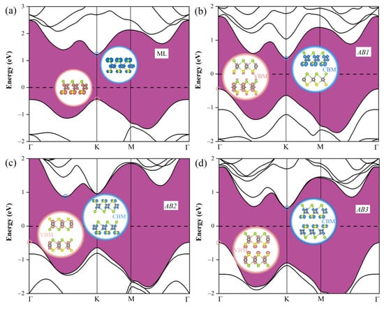 The electronic band structure of WSSe (a) monolayer (ML) and (b) AB1, (c) AB2, and (d) AB3 bilayers. The inserts show the spatial distributions of conduction band minimum (CBM) (blue areas) and valence band maximum (VBM) (pink areas), respectively. We set the isosurface value to 0.018 e/Å3.