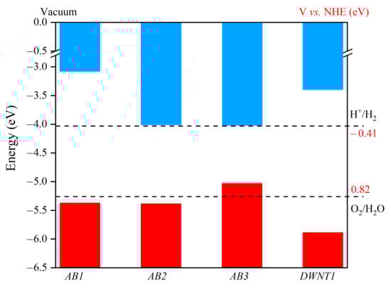 The potential of the CBM (blue region) and VBM (red region) of WSSe bilayer with different stacking patterns (AB1, AB2, and AB3) and WSSe DWNT1, with respect to the vacuum level (labeled as 0 eV). The dashed lines mark the oxidation potential of O2/H2O and reduction level of H+/H2. The pH is set to 7.