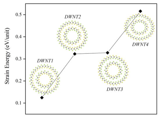 where andare the total energy and the number of unit cells in the Janus WSSe DWNTs, meanwhile,andare corresponding value for the WSSe monolayer, respectively. As displayed in Figure 1, the DWNT1 configuration has the lowest strain energy among these four cases, which is in line with our expectation.