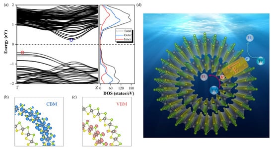 The electronic properties of WSSe DWNT1 (a), including the projected density of state (right) and band structure (left). The Fermi level (labeled with the dashed line) is set to 0 eV. The spatial distributions of (b) CBM (blue areas) and (c) VBM (pink areas) of WSSe DWNT1. We set the isosurface value to 1 × 10−3 e/Å3. (d) The work mechanism of WSSe DWNT1 for photocatalytic water-splitting.