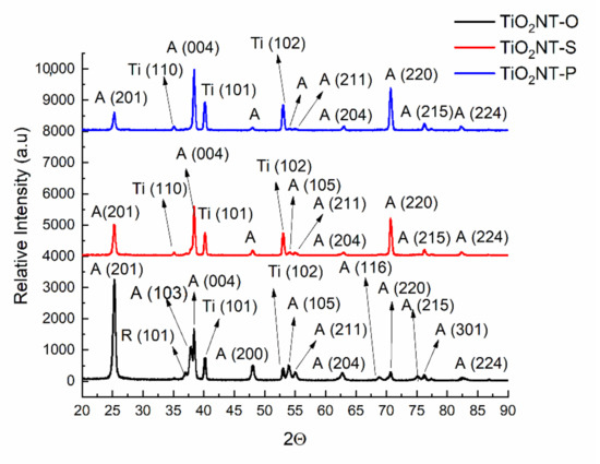 The crystalline structures obtained with the different anodising processes are presented in Figure 2. Anatase and titanium were the main constituents of the three materials. A low intensity rutile shoulder at 37° and another shoulder at 77° were recorded for TiO2NT-O. Despite the fact that nanotubes grown in aqueous media and annealed at 450 °C [42] typically contain no rutile, a small rutile peak was observed for TiO2NT-P at 77°. Rutile has been reported to have a higher visible light absorbance than anatase, which, on the other hand, has the higher activity in the UV region. A heterostructure composed of the two polymorphs should, thus, have a higher solar photocatalytic activity than the separate phases, as it can utilise a higher percentage of the solar spectrum [50]. The benefits of having rutile in the heterostructure are still not universally acknowledged, as it promotes a fast charge carrier recombination which can diminish the overall efficiency [51]. The peak at 25° for TiO2NT-O has the highest intensity, followed by that of TiO2NT-S, with the peak for TiO2NT-P having the lowest intensity. The different planes of anatase, namely, (103) and (004) were manifested in a bifurcated peak at around 38°. As expected, the thickest layer, TiO2NT-O resulted in the lowest substrate detection and consequently the lowest titanium peak at 41°. It appears that the electrolyte results in growth in a specific direction. The [220] direction is preferred when aqueous electrolytes are used and the [201] direction when the organic electrolyte is used.